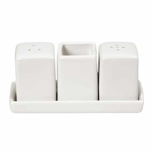 BY ORDER – SIDERS IVORY PORCELAIN SALT, PEPPER, TOOTHPICK POT SET WITH TRAY ESPIEL